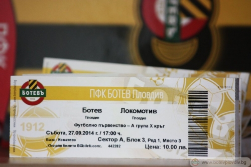 Билетите за двубоя от 10-ия кръг в „А“ група между отборите на „Ботев“ и „Локомотив“ (Пд) ще бъдат пуснати в продажба в понеделник /22 септември/. Продажбата ще започне в 09:00 часа в клубния фен-магазин.Членовете на КПБП ще получат пропуск за Южната трибуна срещу показване на членска карта.Този път изключения няма да бъдат правени!Цената на билета е 8 лв.